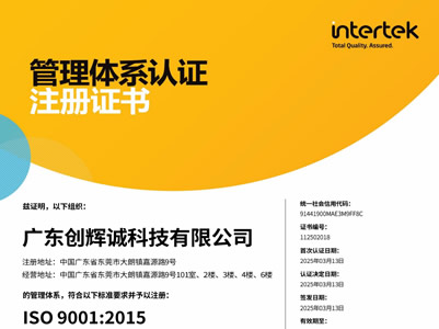 廣東創(chuàng)輝誠(chéng)通過(guò)ISO 9001:2015... 2025年3月13日廣東創(chuàng)輝誠(chéng)科技有限公司順利通過(guò)ISO 9001:2015管理體系認(rèn)證。 創(chuàng)輝誠(chéng)自2004年成立以來(lái)一直致力于從事連接器、線纜... More+