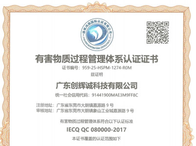 廣東創(chuàng)輝誠(chéng)通過(guò)QC080000-2017... 2025年4月22日廣東創(chuàng)輝誠(chéng)科技有限公司順利通過(guò)QC080000-2017體系認(rèn)證。 創(chuàng)輝誠(chéng)自2004年成立以來(lái)一直致力于從事連接器、線纜組件... More+
